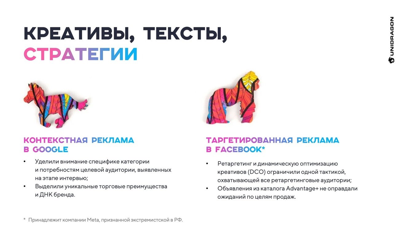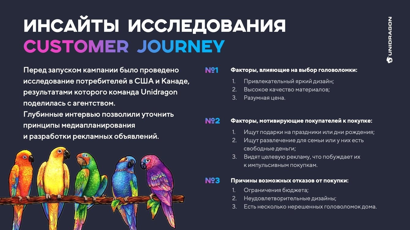 Лидер продаж деревянных пазлов в России — бренд Unidragon — уже несколько лет представлен на рынке Северной Америки. Продукция российской компании завоевывает аудиторию своим ярким дизайном, приятными тактильными ощущениями и высочайшим качеством производства каждой детали. Клиент обратился к нам с целью увеличения онлайн-продаж в новом регионе с приоритетным показателем долей рекламных расходов (ДРР) ниже 30%.