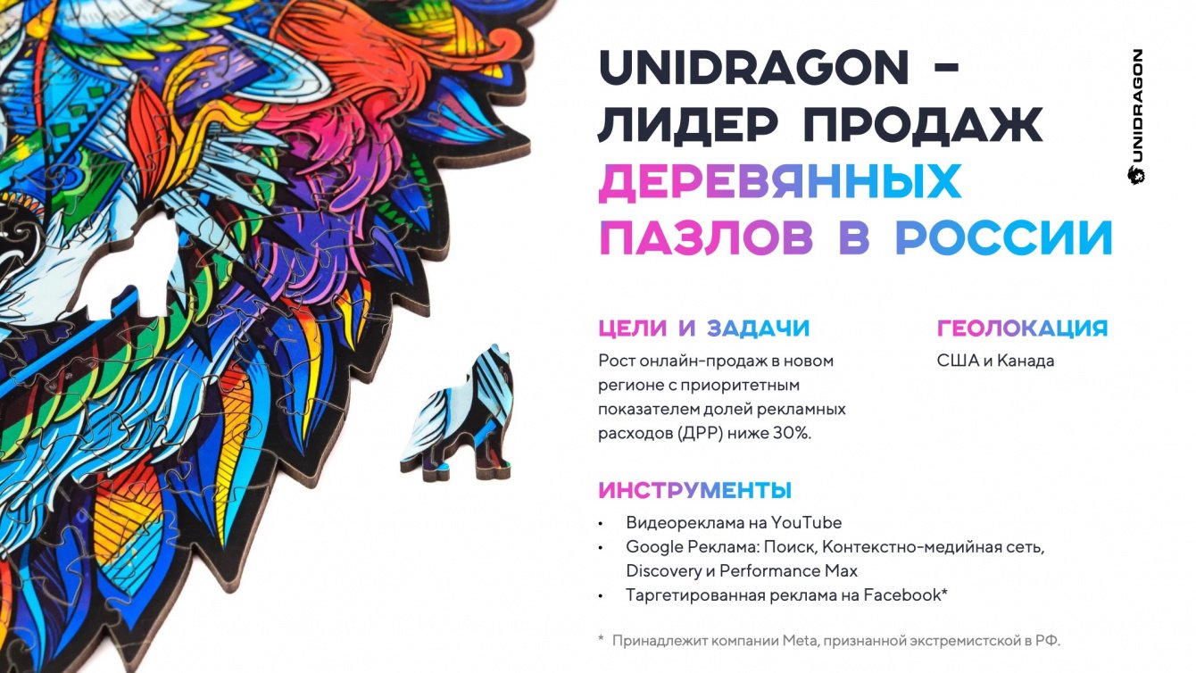 Лидер продаж деревянных пазлов в России — бренд Unidragon — уже несколько лет представлен на рынке Северной Америки. Продукция российской компании завоевывает аудиторию своим ярким дизайном, приятными тактильными ощущениями и высочайшим качеством производства каждой детали. Клиент обратился к нам с целью увеличения онлайн-продаж в новом регионе с приоритетным показателем долей рекламных расходов (ДРР) ниже 30%.