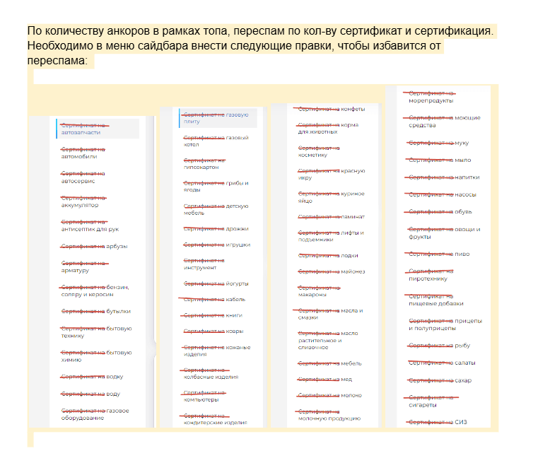 4.Переспам на страницах. В меню был выявлен большой переспам по словам Сертификат/Сертификация. Поисковые роботы индексировали этот контент и это оказывало влияние на ранжирование. Поэтому также была указана данная ошибка для исправления - необходимо было внести корректировки в меню.