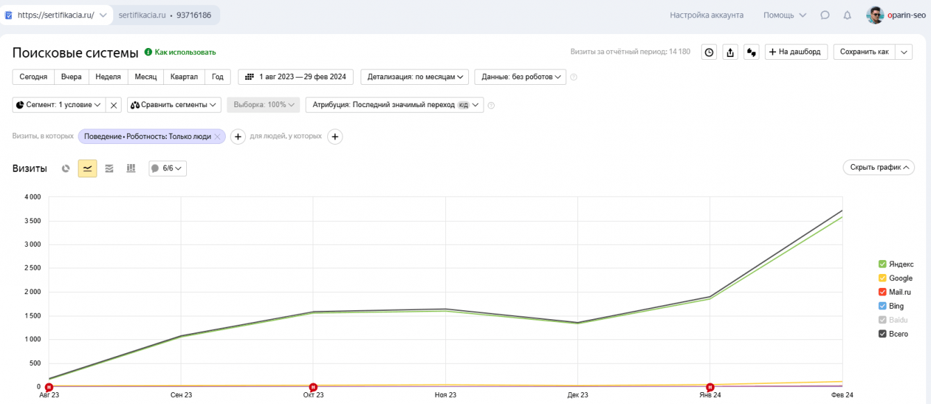 Одним из наиболее ярких показателей успеха стал стремительный рост органического трафика из Яндекса. За отчетный период количество переходов на сайт из этой поисковой системы увеличилось с 170 до 3716 в месяц, что составляет ошеломляющий рост более чем на 2000%!
