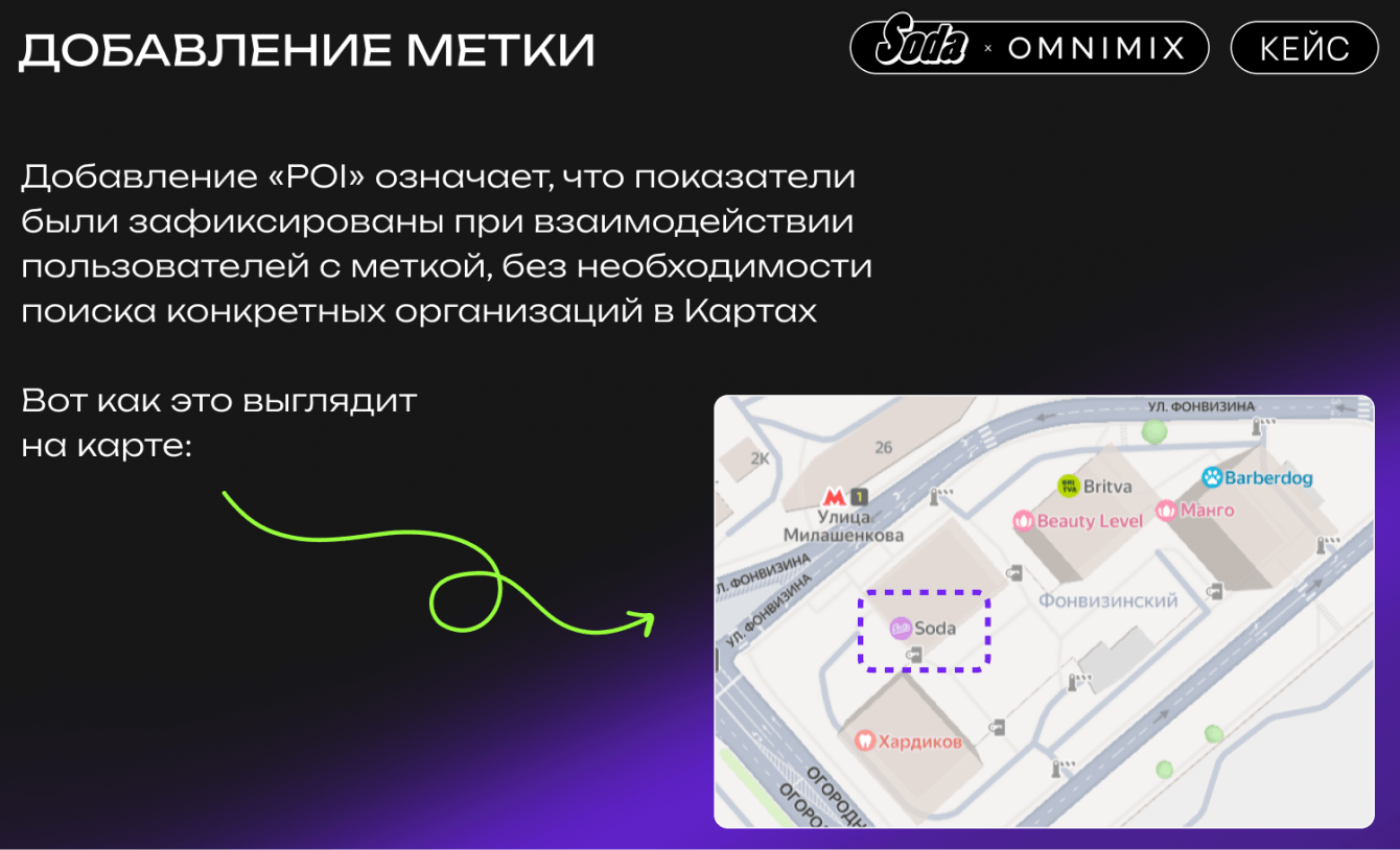 Добавление «POI» означает, что показатели были зафиксированы при взаимодействии пользователей с меткой, без необходимости поиска конкретных организаций в Картах. Вот как это выглядит на карте:
