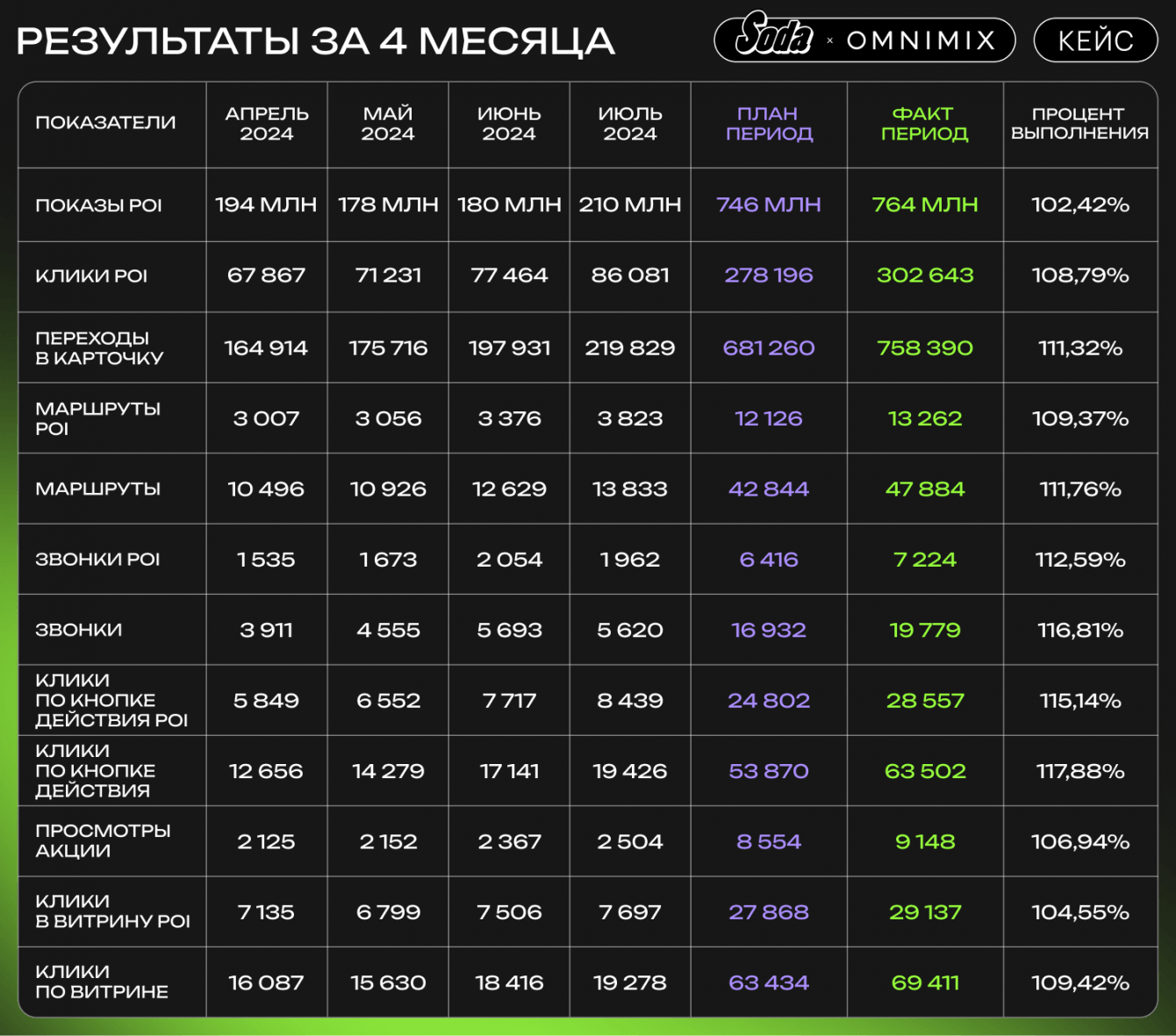 Результаты рекламной кампании за период с 1 апреля по 31 июля 2024 года превзошли все ожидания. В таблице ниже приведены ключевые показатели: