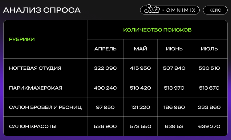 Практически во всех рубриках заметен рост спроса на услуги, особенно ближе к лету, что подтверждает сезонный характер индустрии красоты. Количество поисков по ключевым рубрикам подтверждает необходимость приоритета карточек Soda, чтобы не упустить целевую аудиторию.
