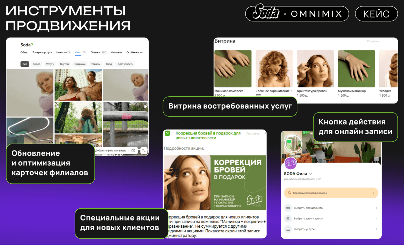 Карточки всех филиалов Soda на Яндекс Картах были обновлены и оптимизированы. В них была добавлена информация о текущих акциях, обновлены прайс-листы, а также загружены новые фотографии и видеоматериалы, демонстрирующие интерьер салонов, процесс работы мастеров и результаты предоставляемых услуг.