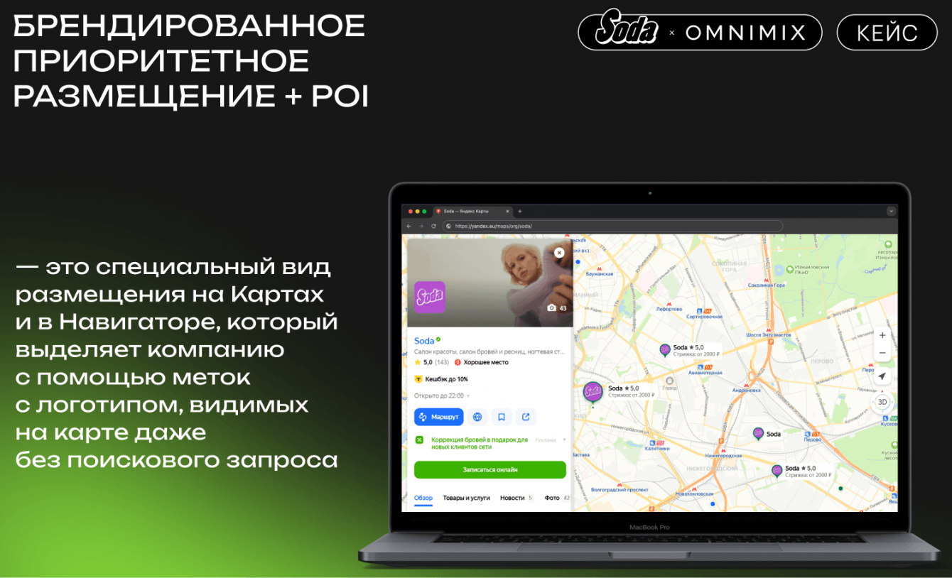 Приоритетное размещение карточек Soda на Яндекс Картах значительно увеличило охват целевой аудитории и повысило узнаваемость бренда.