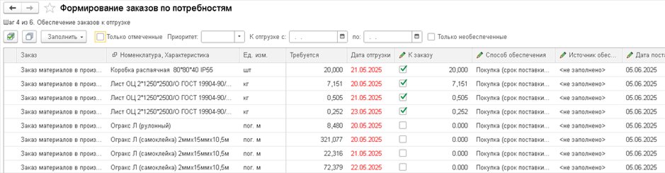 Функциональность закупок мы реализовали на базе типовых инструментов ERP. Настроили систему автоматического формирования заказов поставщикам по потребностям производства и склада. Это помогло исключить ручной расчет дефицита и повысить скорость реакции на потребности.