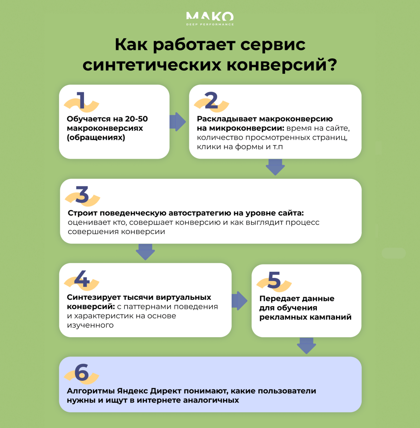 Для быстрого кратного роста нам нужны были большие объемы данных. Поэтому решили использовать сервис синтетических конверсий, который хорошо показал себя на проектах демократичного и бизнес-сегментов.
