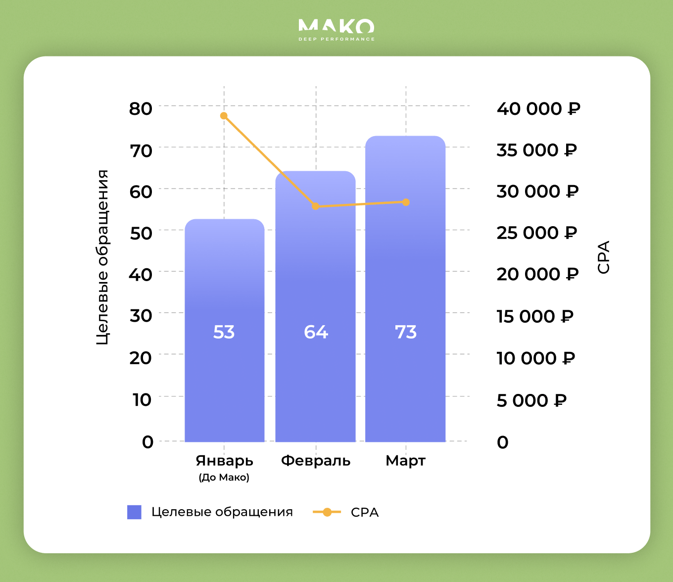 Выстроили правильную архитектуру рекламы и за первый месяц увеличили целевые обращения (ЦО) на 20%, а во втором еще на 15%. Итого стали получать по 73 ЦО в месяц с CPA 28 351 р., что на 28% ниже, чем было ранее у застройщика.