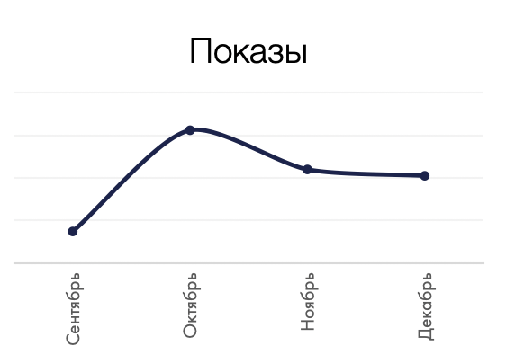 Пик по показам в ПромоСтраницах пришелся на октябрь, так как в этот период кампании получили усиление после первых двух недель запуска в сентябре.