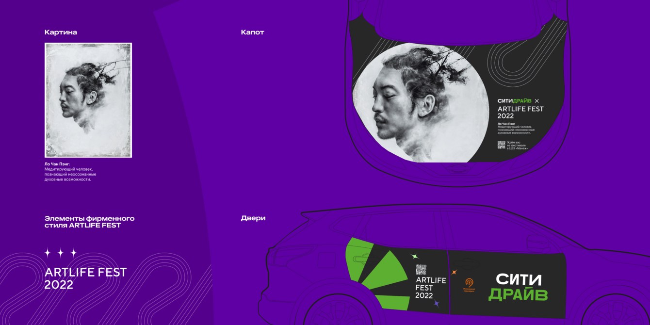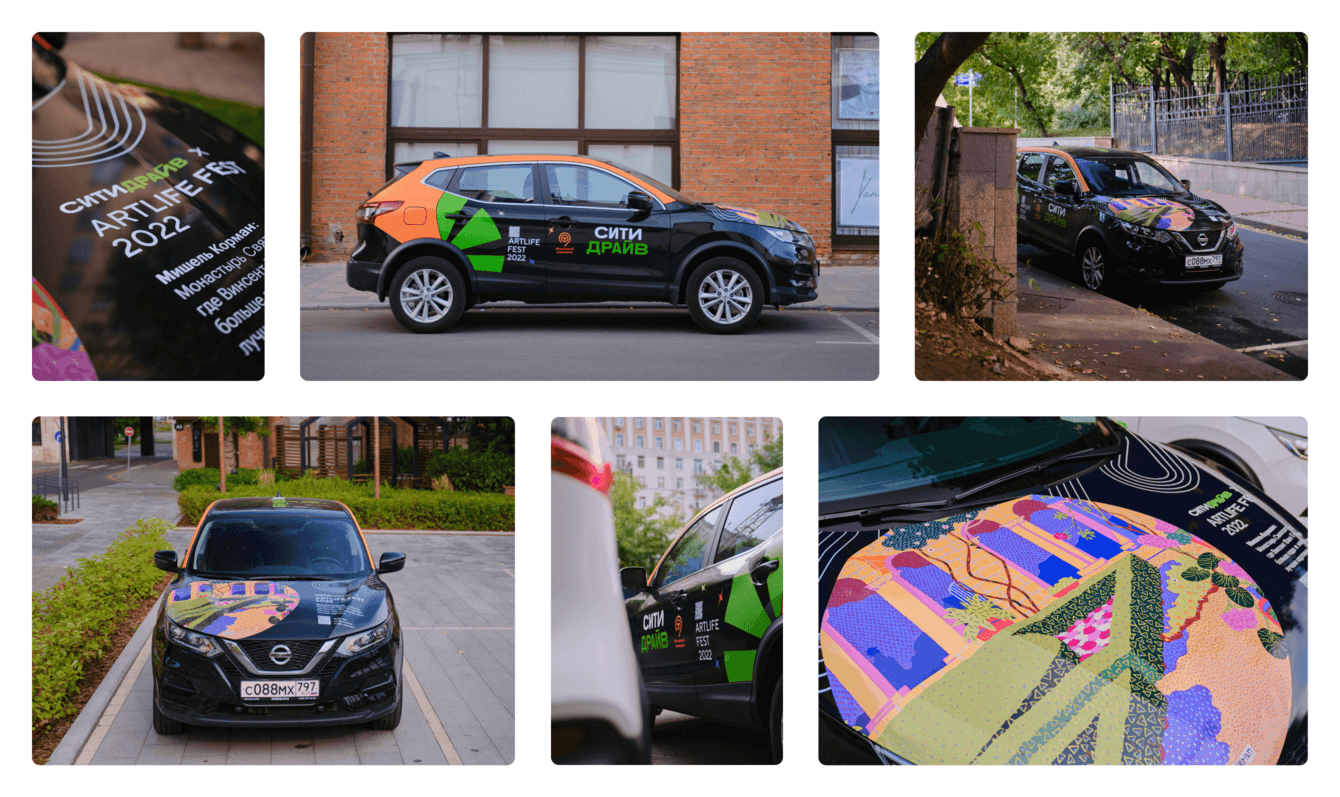 Мы разместили на капотах автомобилей Ситидрайва картины пяти художников-участников фестиваля этого года. Всего — 24 автомобиля с уникальной оклейкой.