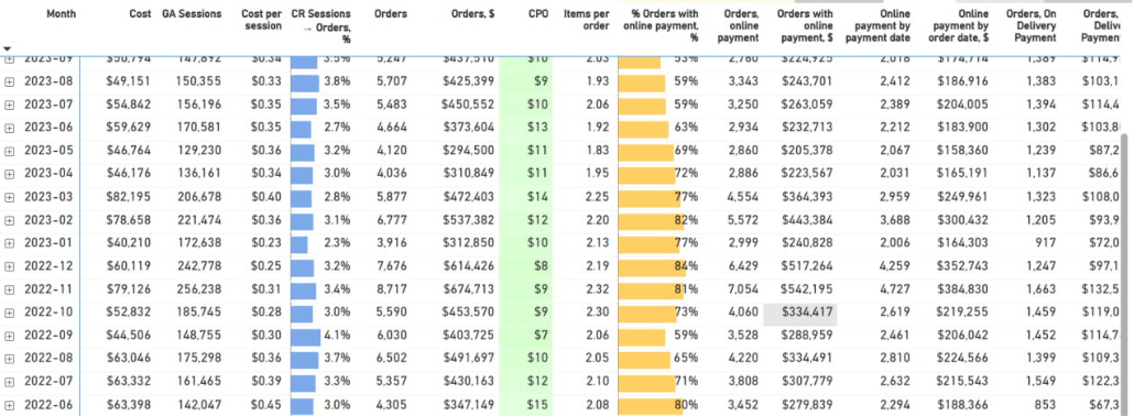 Минусом сотрудничества с Join Metrics стало то, что при планировании работ мы не договорились о визуализации всех отчётов. На старте нам было важно выстроить минимальную отчётность в табличном виде. Но в процессе стало очевидно, что нужно визуализировать данные в виде разных дашбордов, чтобы сделать информацию визуально понятной и доступной для всех.