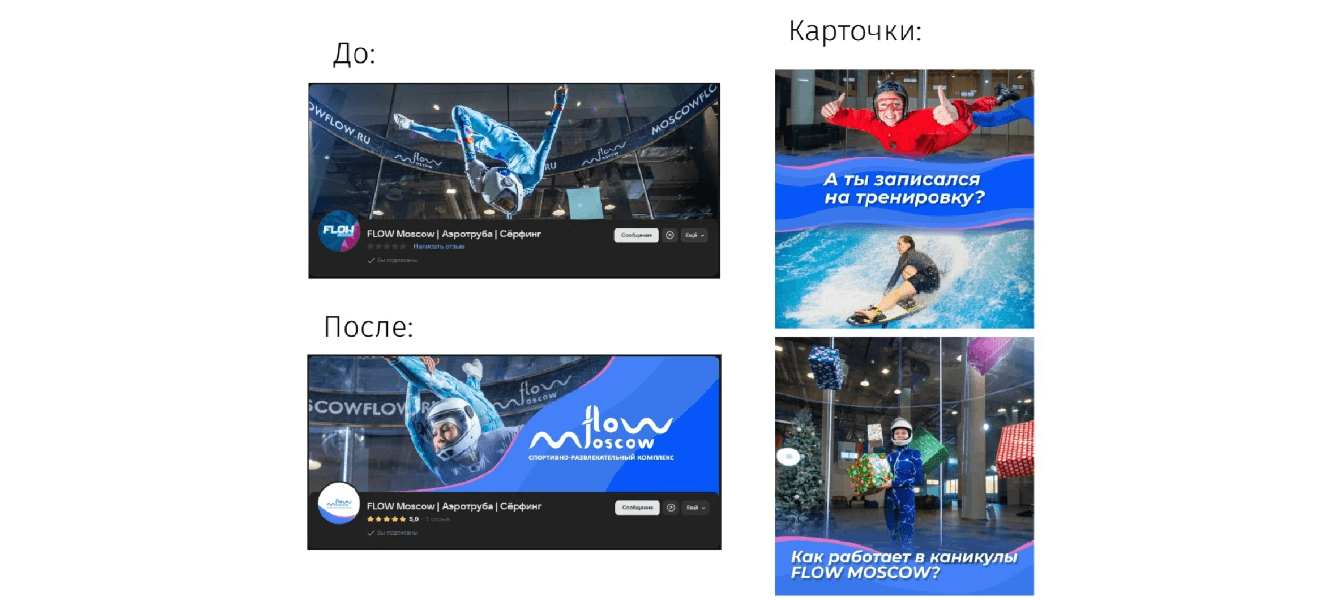 Flow Moscow — спортивный центр с крупнейшей аэротрубой в столице и первой в РФ искусственной волной City Wave. Пространство также включает открытый бассейн, кафе и зону для хранения снаряжения. Основной вызов — повысить узнаваемость бренда, привлечь новых клиентов и увеличить продажи через социальные сети.