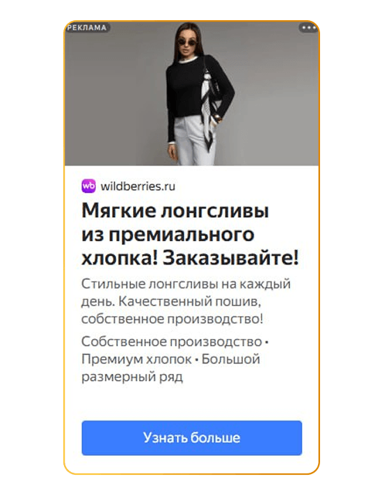 Нативный формат для поиска.Объявления подтягивали фотографию товара автоматически, без лишних рамок и логотипов. Это имитировало органическую выдачу Wildberries — пользователь видел вещь в знакомом интерфейсе, что повышало доверие и снижало «баннерную слепоту».