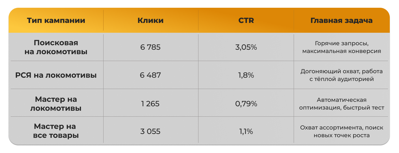 Такое разделение позволило нам гибко управлять бюджетом, быстро находить рабочие связки и масштабировать то, что даёт результат