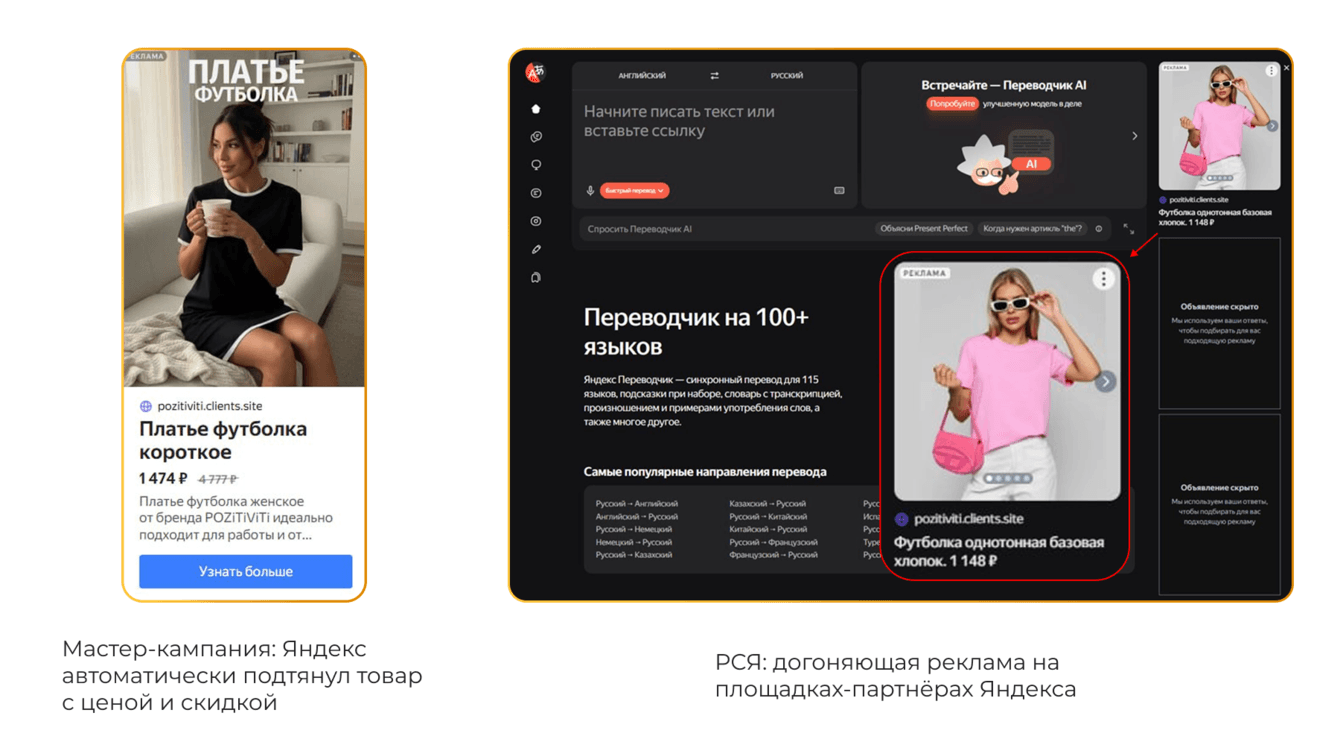 На весь ассортимент мастер-кампания работала иначе: Яндекс автоматически подбирал товар из каталога под запрос пользователя. Мы настроили фильтрацию нерелевантных запросов (чтобы не показывать платье-футболку по запросу «вечернее платье») и контролировали, чтобы «слабые» товары не перетягивали бюджет у локомотивов.