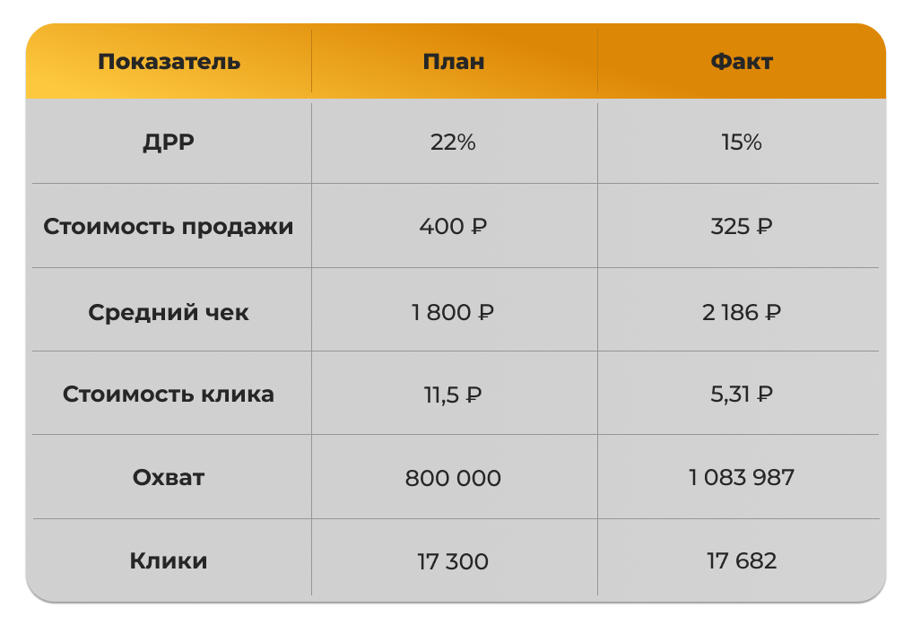 Результат: комбинация форматов позволила снизить среднюю цену клика до 5,31 ₽ и получить максимальный охват без перегруза пользователя информацией.