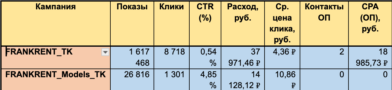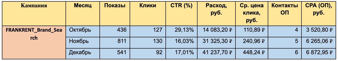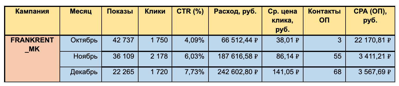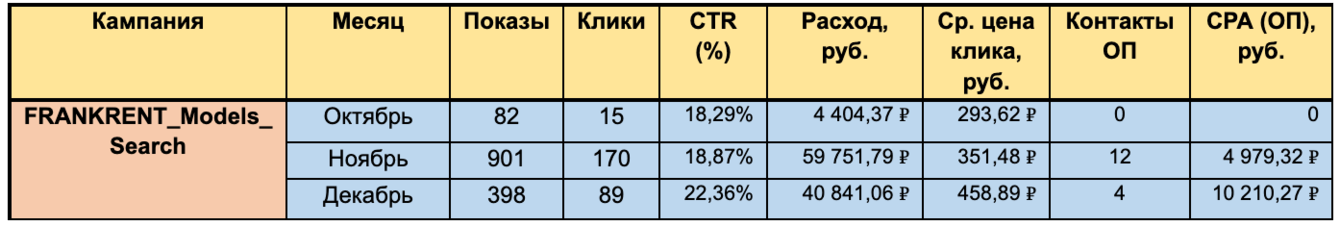 Была запущена брендовая рекламная кампания. В ней использовали ключи с названием бренда, так как он достаточно широко известен аудитории (“frank rent”, “франк рент” и т.д.) Эта кампания больше имела медийную направленность, но показала значительно лучшие результаты, чем товарная: 15 контактов по цене в 3 раза ниже, чем с товарной кампании.