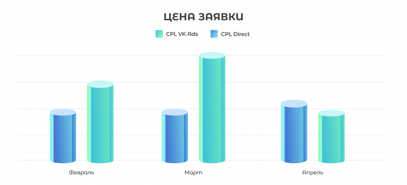 В апреле нам удалось снизить CPL практически в два раза в сравнении с февралем, при этом вдвое увеличили количество заявок.