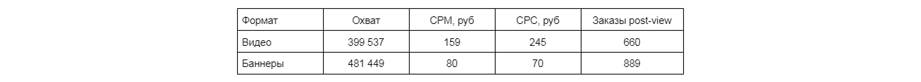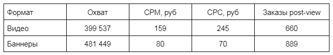 Если сравнивать два формата, то показатели у баннеров нам понравились больше: СРМ получился ниже, заказов больше. Для снижения CPM можно попробовать сменить стратегию в следующем флайте.