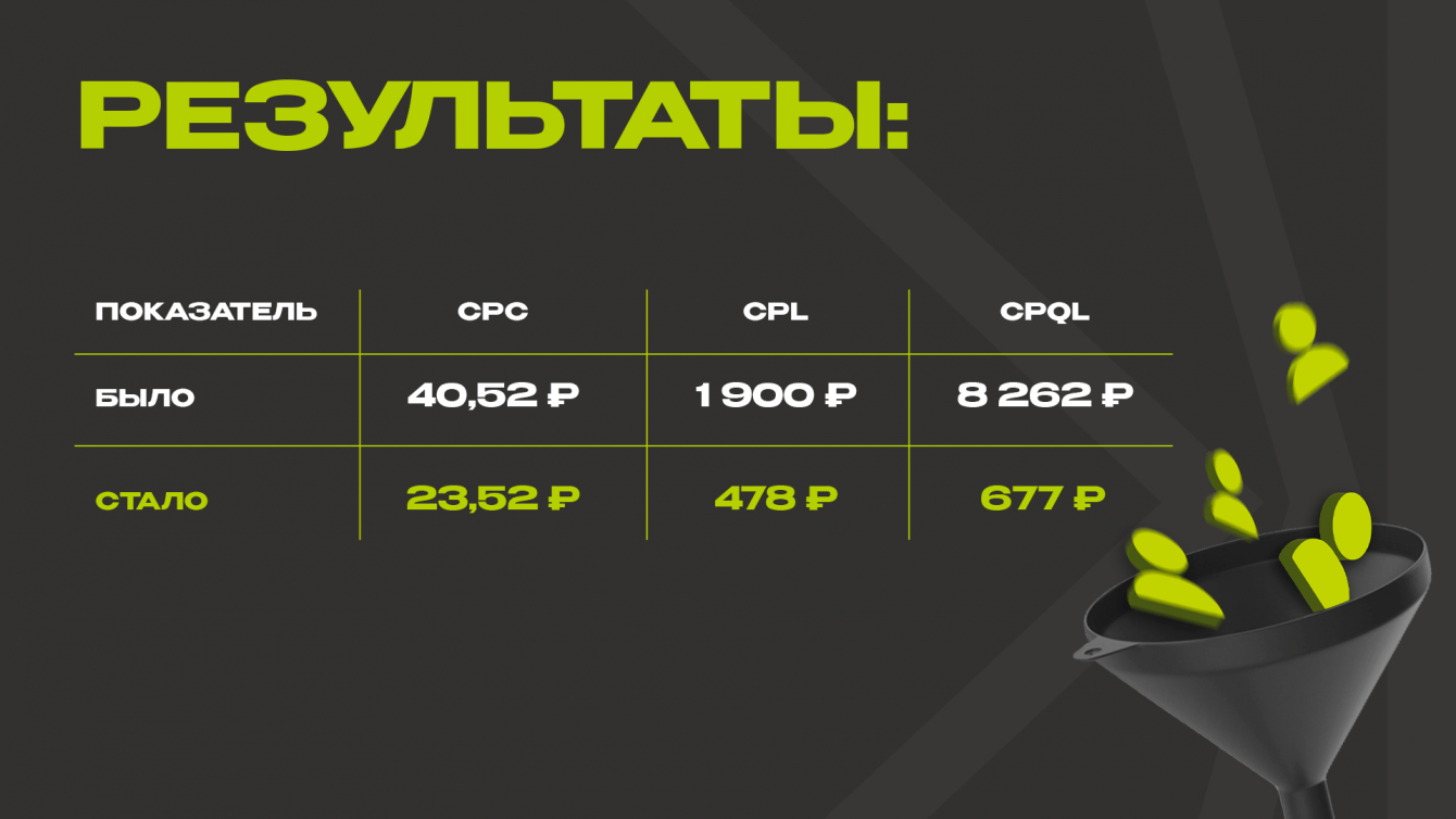KPI проекта — за месяц привлечь не менее 150 лидов и удержать стоимость заявки не выше 1 900 ₽.