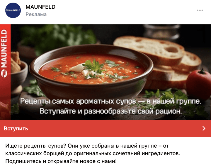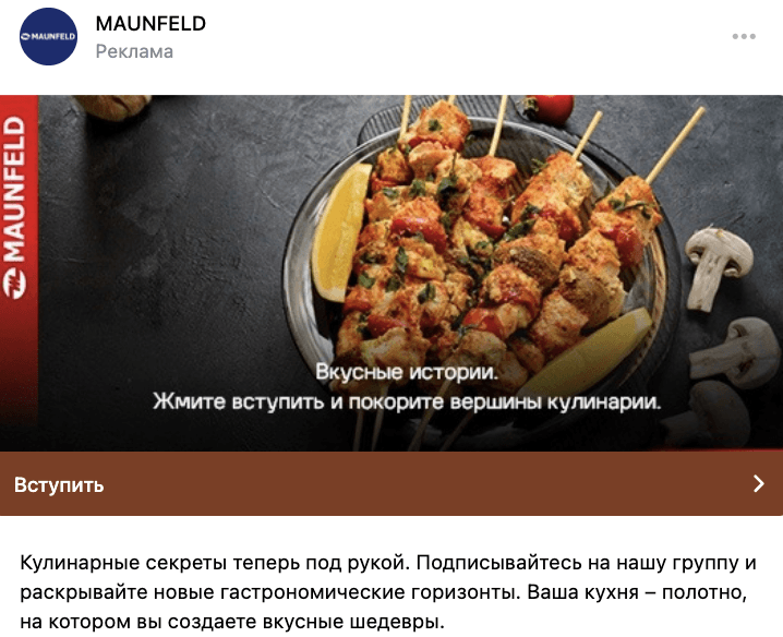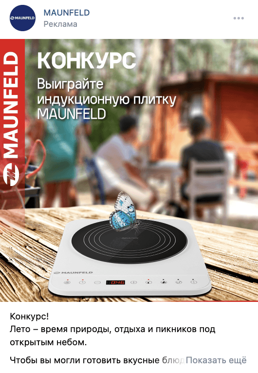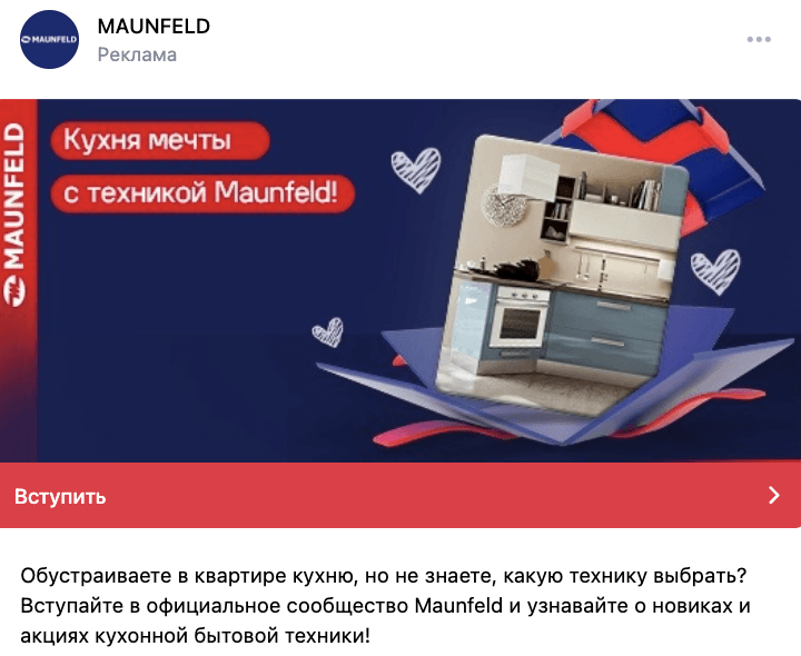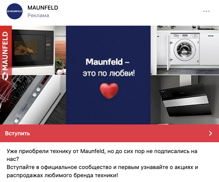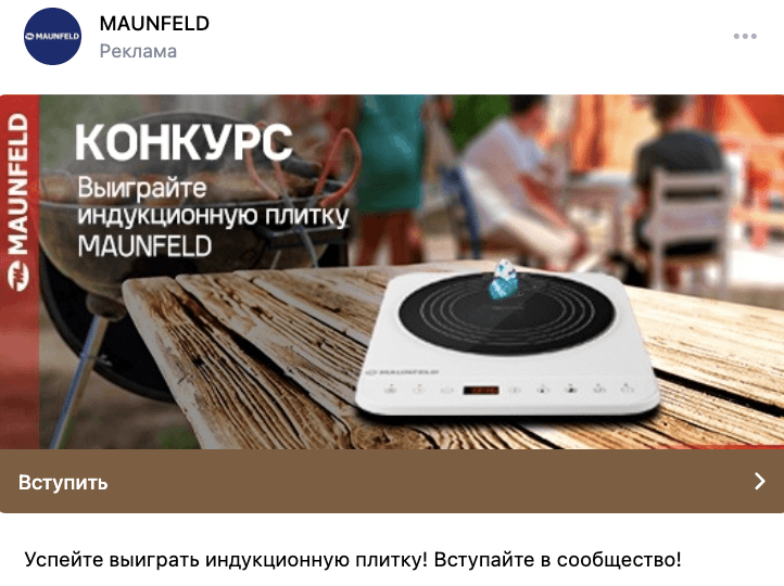 Для продвижения своей продукции бренд MAUNFELD привлекает подписчиков в сообщество ВКонтакте, где публикует информацию о товарах, скидках и акциях, делится рецептами, создает видеоролики и проводят конкурсы.