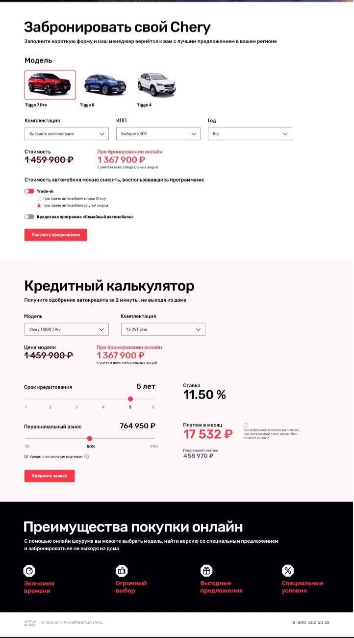 Совместно с креативным директором 1994lab Валерием Фироновым была разработана новая посадочная страница. Был использован минималистичный дизайн, устранены все неэффективные лидогенерационные инструменты и блоки, усложнявшие пользовательский путь. Сам сервис по онлайн-бронированию автомобилей был переведен на отдельную посадочную страницу с возможностью получать актуальную информацию по выгодам онлайн-заказа конкретных моделей и комплектаций за пару кликов. В качестве платформы разработки использовалась Tilda — недорогая, функциональная, достаточно простая и быстрая. Платформа позволяет «поднять» проект в кратчайшие сроки и при необходимости обслуживать лендинг любому сотруднику, даже не имеющему специальных навыков.