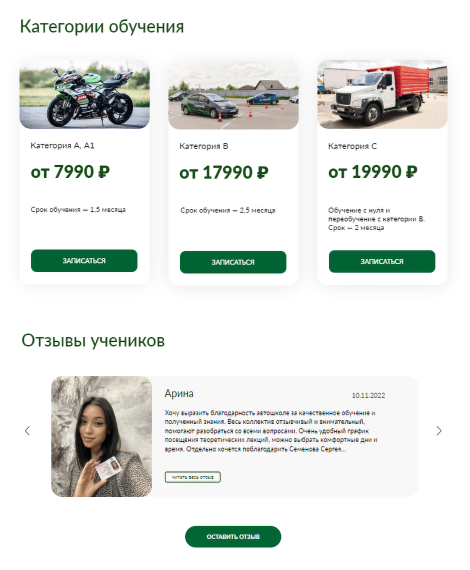 Провели фотосессию автопарка и инструкторов, собрали отзывы студентов, сформировали преимущества в продающие маркетинговые смыслы и создали красивый, высококонверсионный сайт.