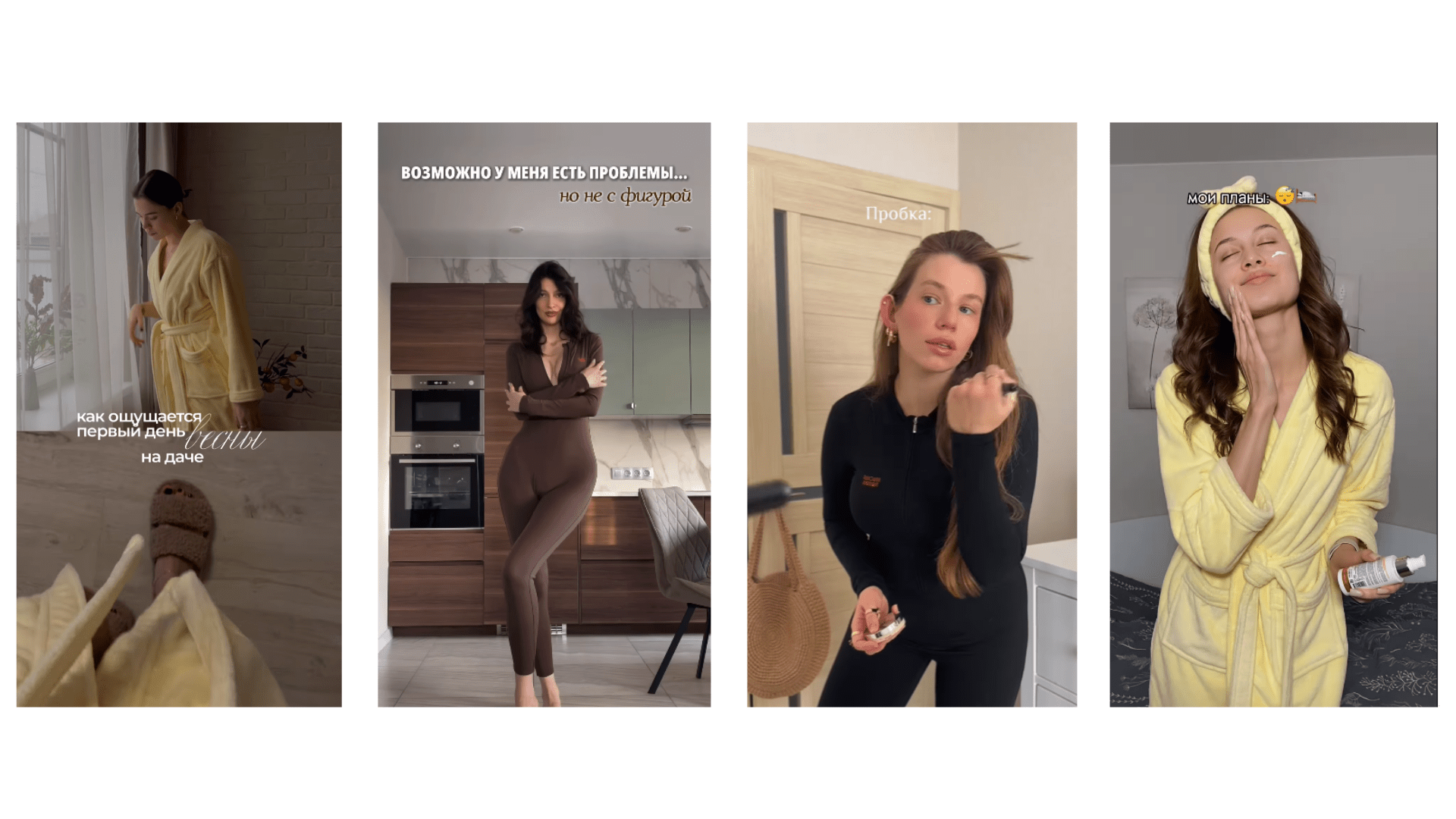 Важно было принять во внимание, что блогеры снимали ролики с разными видами изделий — спортивными и банными. И референсы, в которых выигрышно можно было показать комбинезон, не подходили для демонстрации халата или накидки.