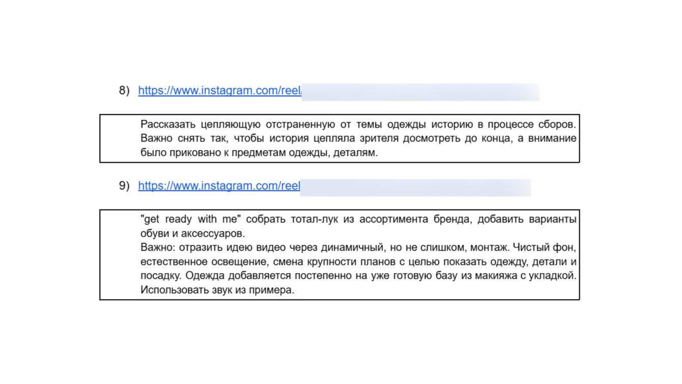 Далее идет перечень референсов. И к каждому — небольшое описание, в котором указано что и как лучше снять, какие элементы (звук, монтаж, подачу) оставить как в оригинале, а какие адаптировать под себя.