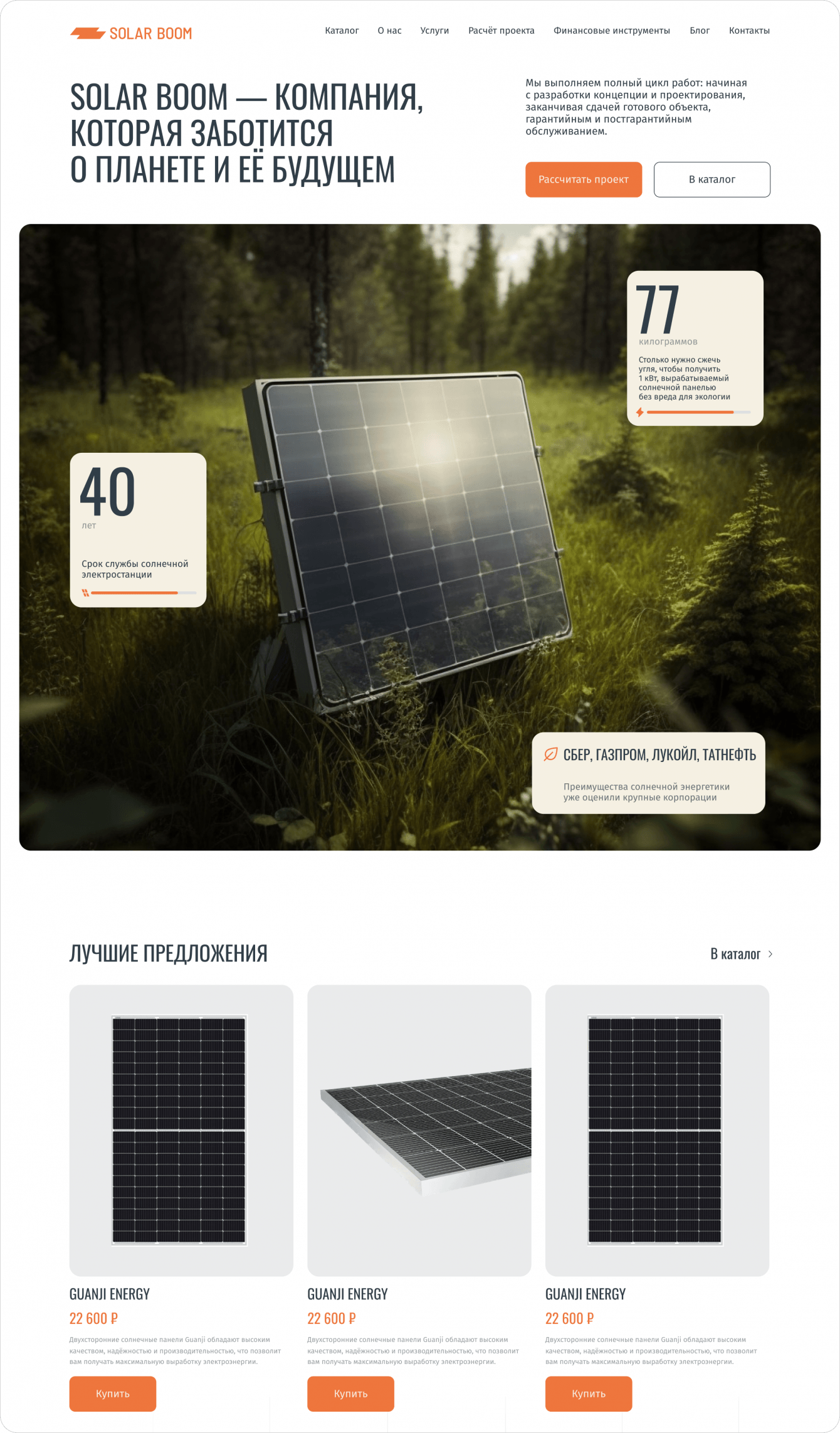 Проект разработки интернет-магазина для компании Solar Boom успешно реализован в установленные сроки. Был создан многофункциональный веб-ресурс, предлагающий широкий ассортимент товаров для возобновляемой энергетики, включая детально проработанный каталог с продвинутым поисковым фильтром. Интернет-магазин оснащен интуитивно понятными инструментами для пользователей, такими как калькуляторы для расчета экономической выгоды и подбора оптимальных решений, и предлагает возможность обратной связи для индивидуальных консультаций.
