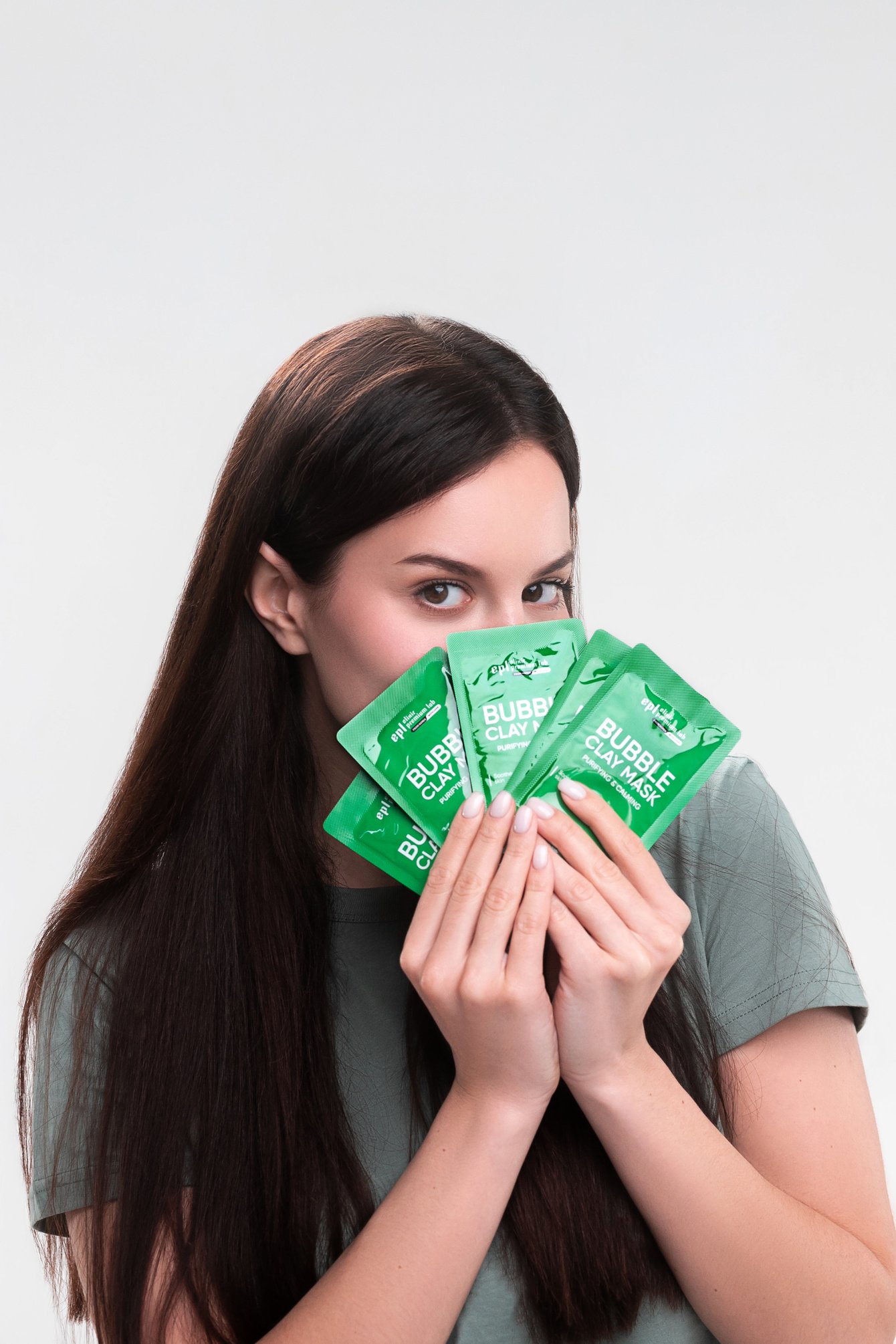 - Текстура: выдавить маску из пакета, акцентируя внимание на ее цвете и консистенции.