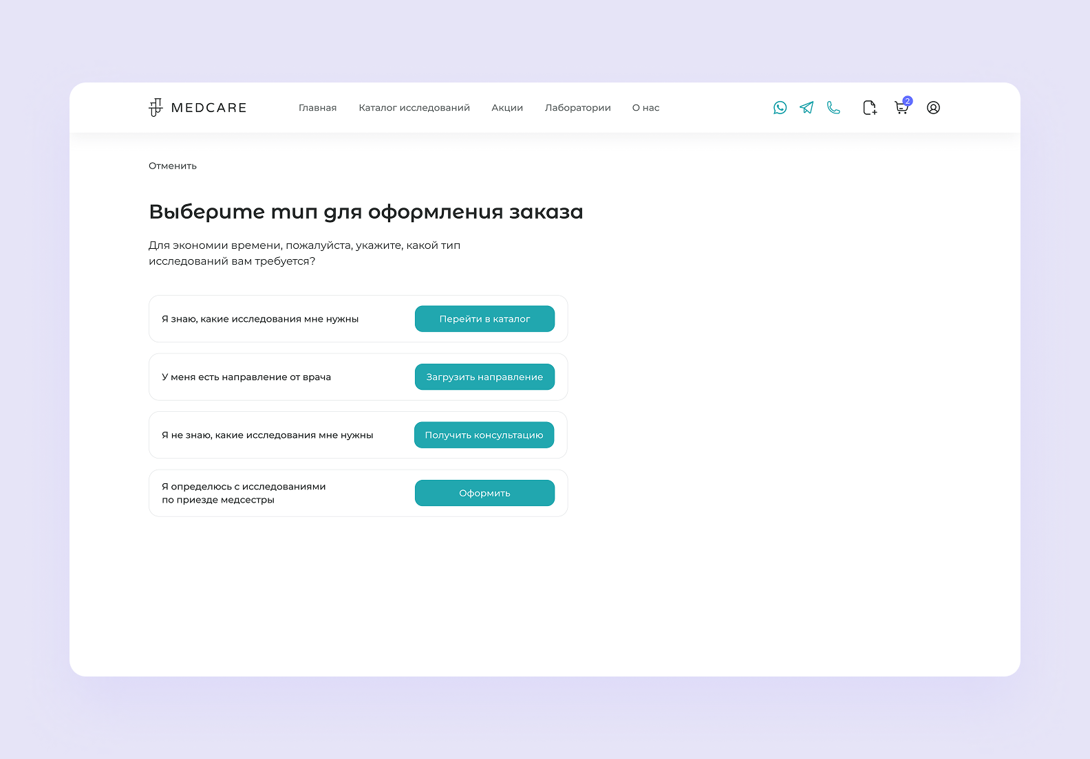 После того, как пользователь нажимает кнопку оформить вызов, просим указать тип исследования — это сэкономит время и медсестре, и самому пациенту. Но всегда оставляем выбор и предлагаем несколько опций — выбрать конкретный анализ из каталога, загрузить направление врача, которое увидит медсестра, или получить консультацию.