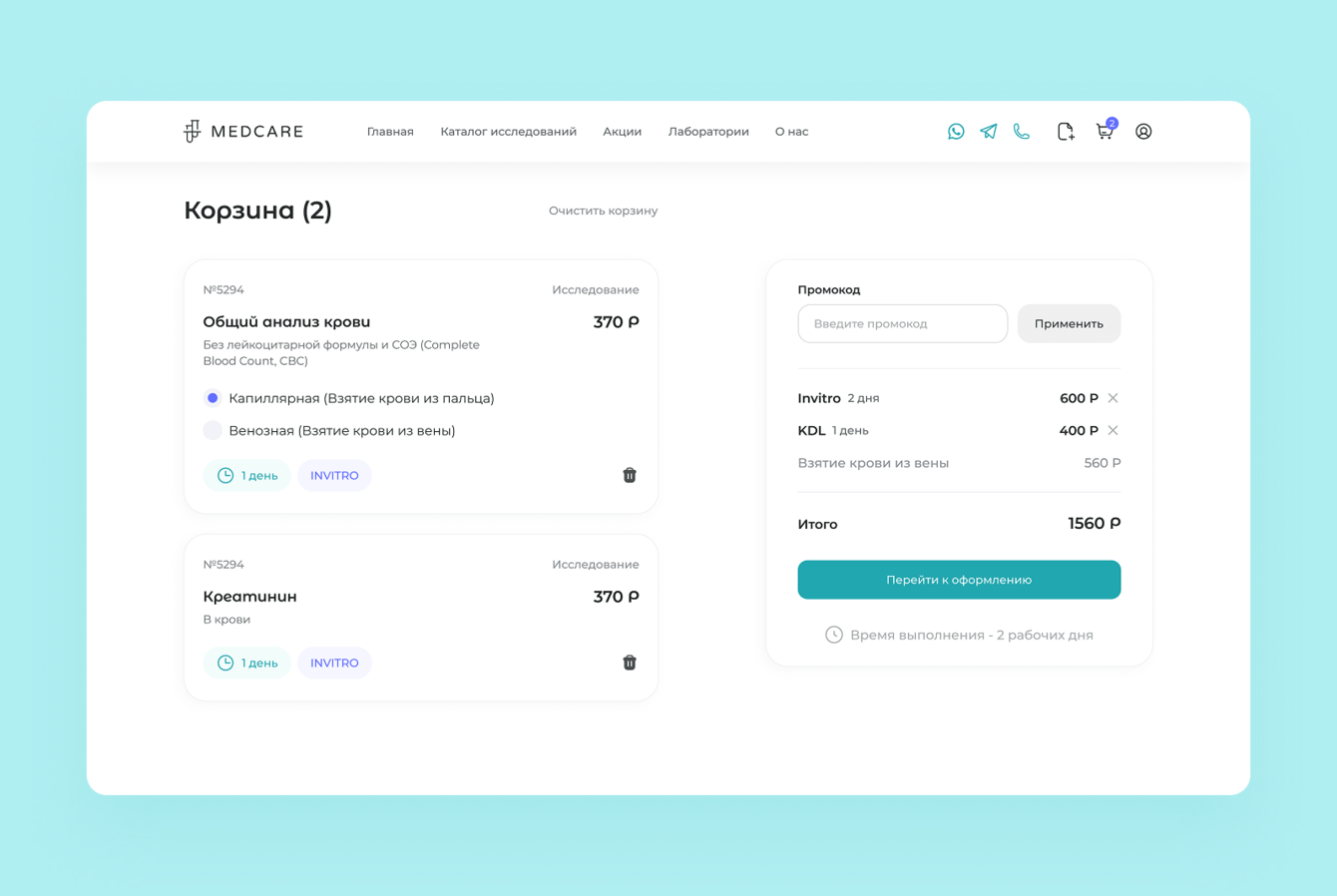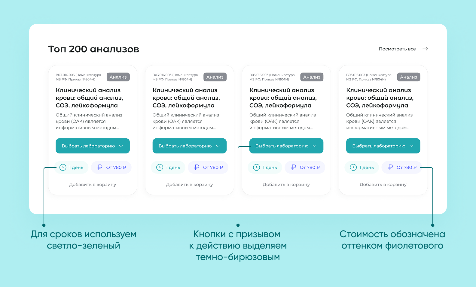 В интерфейсе MedCare много акцентов: кнопки с призывами к действию, информация о лабораториях, сроках готовности анализов, цены и другие важные элементы. Чтобы не перегружать и не запутать пользователя, у каждого типа информации есть свой цвет.