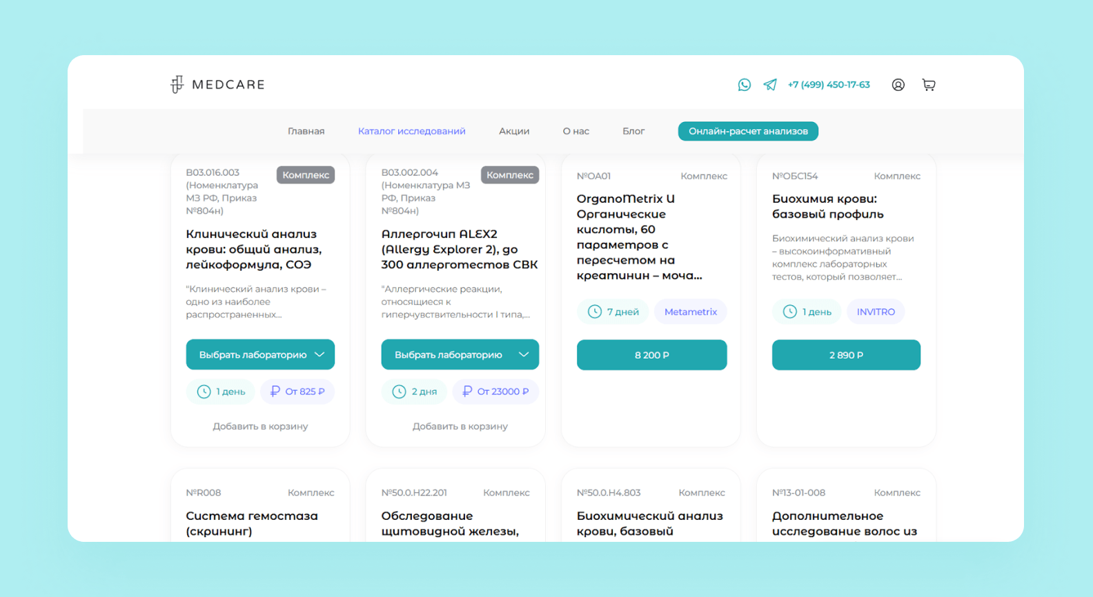 Среди партнеров MedCare ведущие лаборатории: INVITRO, KDL, LabQuest, Metametrix и другие, а в каталоге свыше 2000 исследований — от общего анализа крови до исследования генома, которое выявляет риски по здоровью.