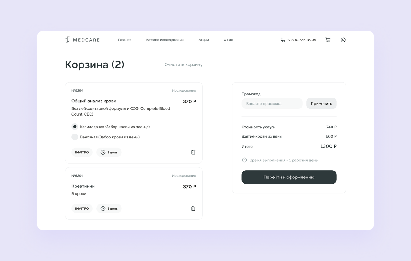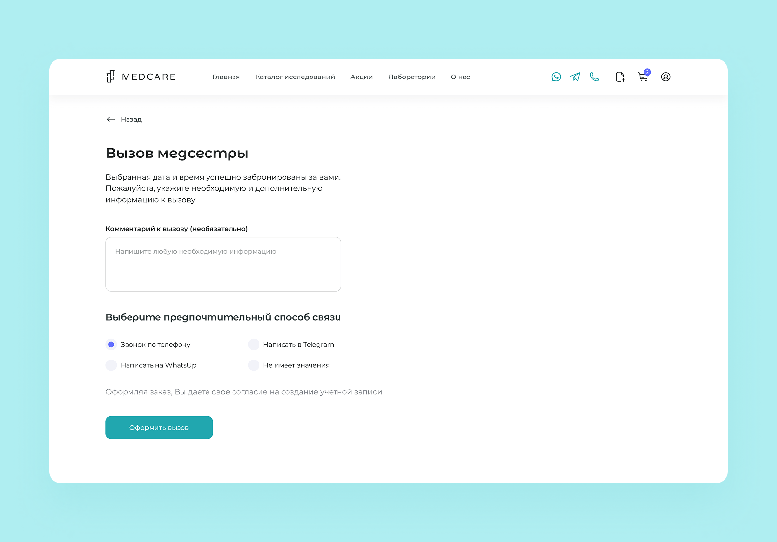 Для взятия анализов нужно оформить вызов медсестры. Сначала пользователь указывает удобную дату и время. А после на отдельной странице указать в комментарии дополнительную информацию и выбрать способ связи.