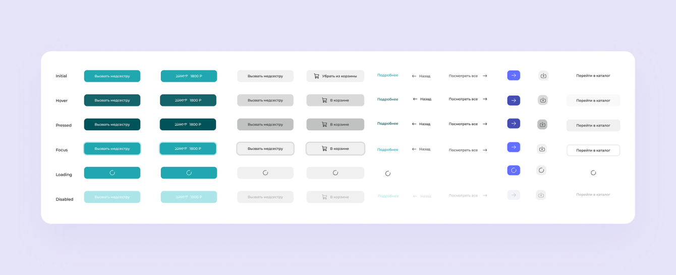 Один из блоков UI-kit — кнопки в разных состояниях: