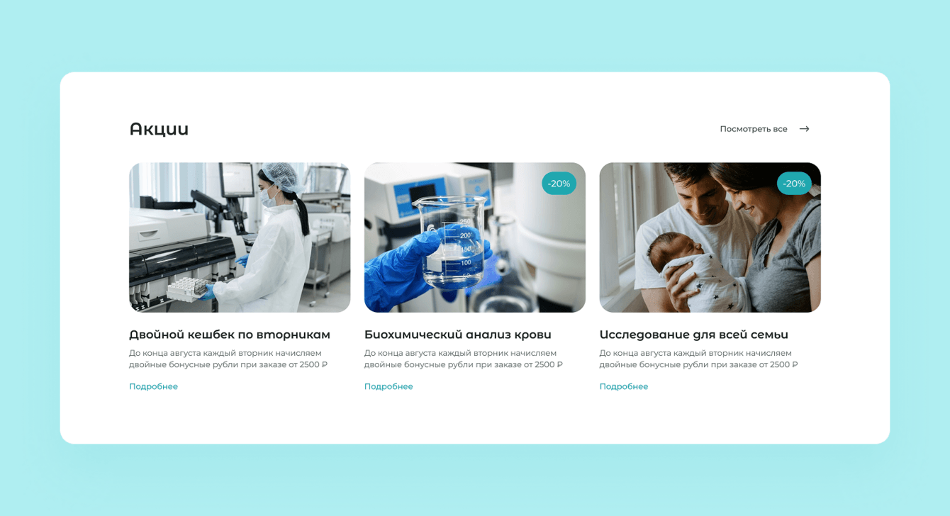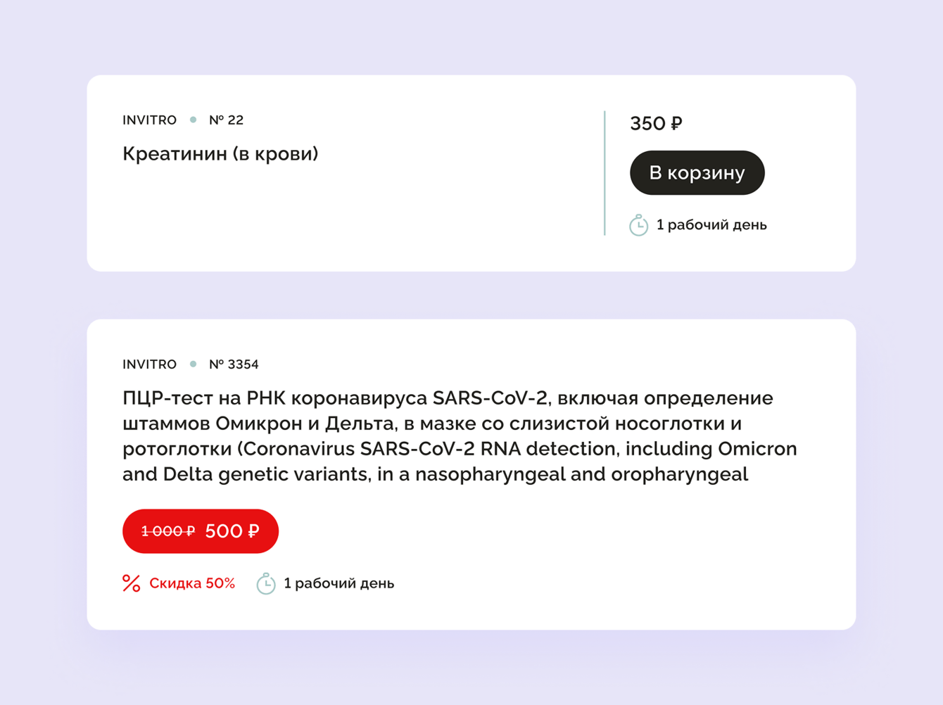 Еще один макет со старым дизайном: здесь использованы разные цвета для одного и того же акцента с ценой. А яркий красный цвет, хоть и должен привлечь внимание к скидке, ассоциируется с ошибкой и может повысить тревожность. Для медицинских порталов лучше выбрать более нейтральные оттенки.
