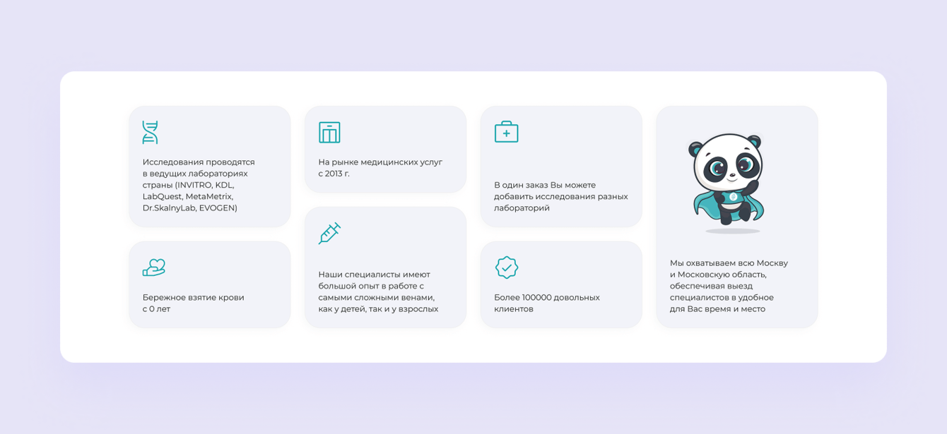 Дизайн карточек на главной странице, которые рассказывают о преимуществах MedCare:
