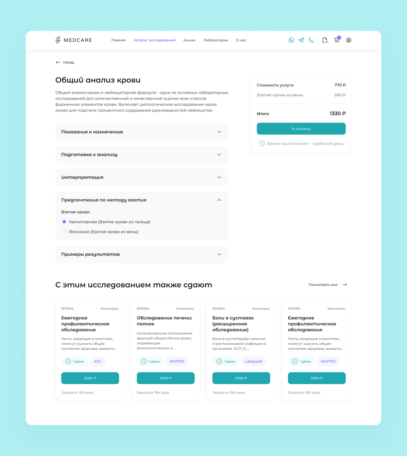 Из общего каталога исследований пользователь может попасть на отдельную страницу анализа и изучить всю важную информацию о нем подробнее. Здесь же можно указать предпочтения по методу взятия крови — из пальца или вены. Да, не самая приятная тема, но как иначе провести диагностику