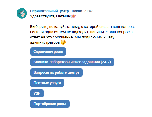 Чат-бот: подписчики сообщества получают оперативные ответы на сообщения, удалось оптимизировать рабочее время менеджеров.
