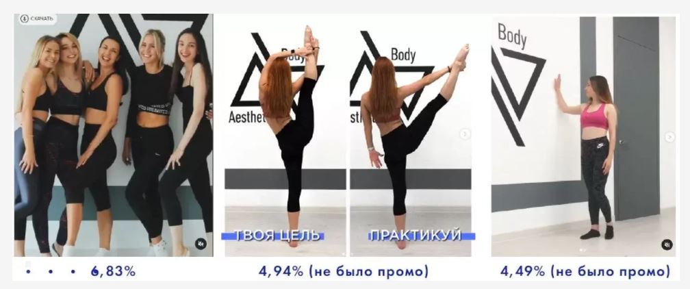 Одной из гипотез было то, что некоторые видео в ленте были непрофессионального качества, так как снимались тренерами на телефон. Однако возражение не подтвердилось, в ТОП постов по ERR попал пост, снятый на телефон