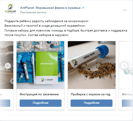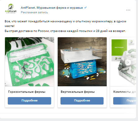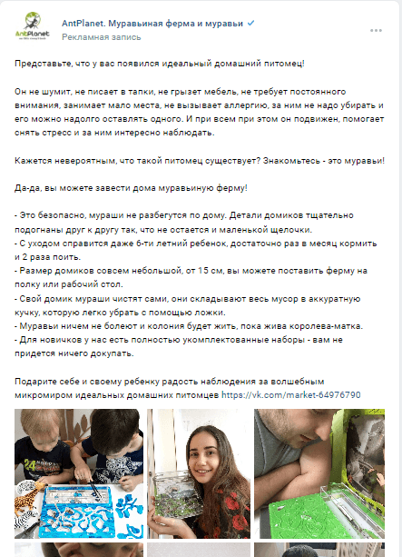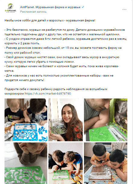 Для аудитории, уже знакомой с товаром, дали более подробное описание: из чего сделаны фермы, акции, наличие аксессуаров и другая, более подробная информация о муравьиных колониях.