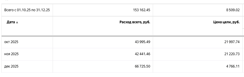 Стоимость лида (CPA): снизилась до ~4 800 руб. — это на 20% ниже нашего KPI.