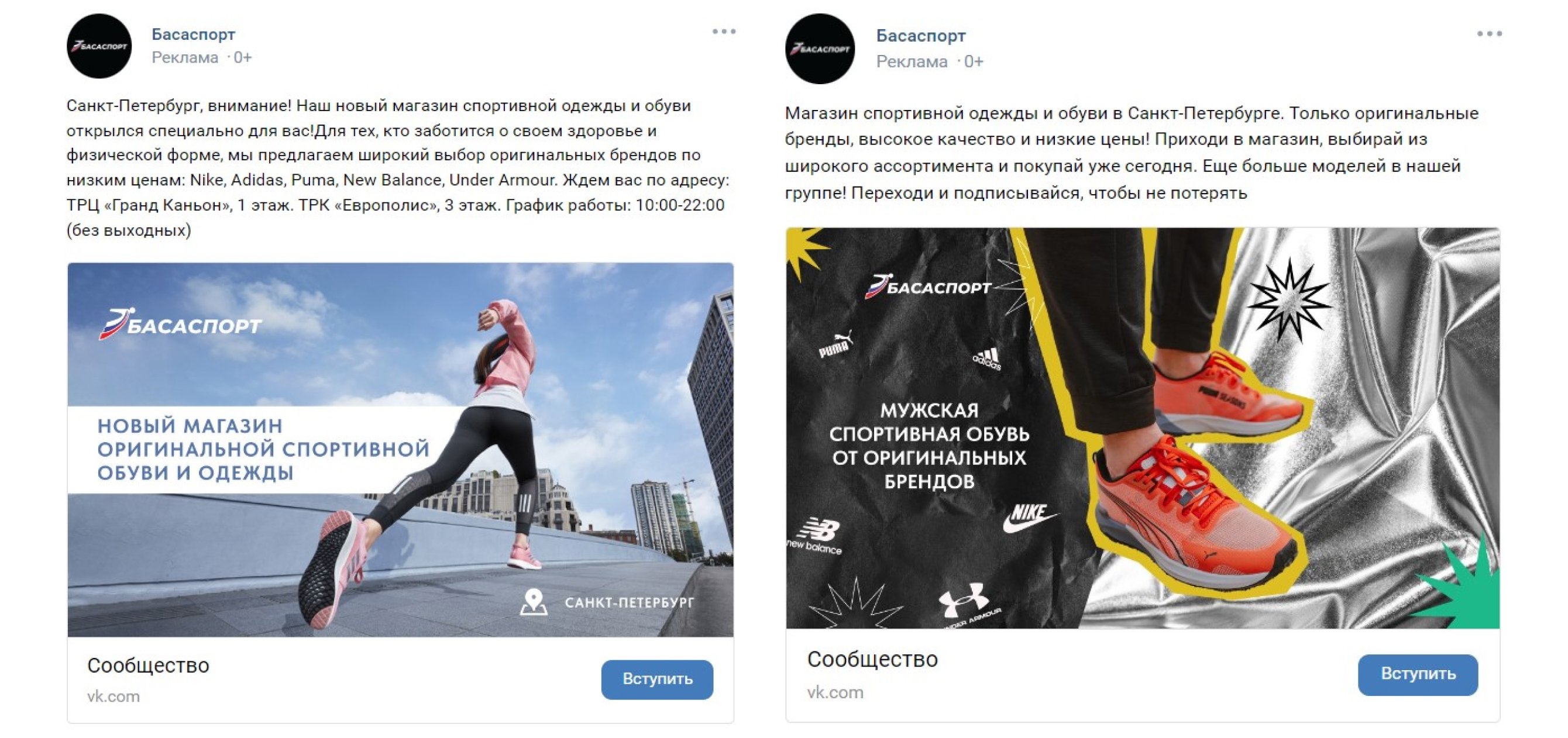 Для увеличения узнаваемости бренда нами была запущена рекламная кампания с информированием общественности о магазине «Басаспорт». Так как магазин относится к сфере продажи одежды и обуви, продукт решает базовую потребность людей и потенциальным потребителем может быть абсолютно любой человек, то показ рекламы был настроен на широкую аудиторию всех жителей Санкт-Петербурга (с ограничением по возрасту от 16 до 50 лет). Объявления в данном случае были нейтральными и выглядели нативно, не содержали прямых призывов купить и вели людей с рекламных объявлений в сообщество магазина для более подробного знакомства с компанией.