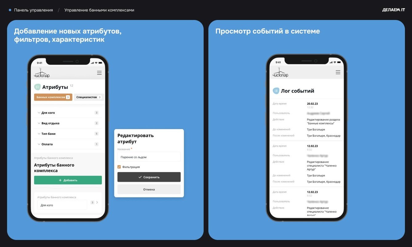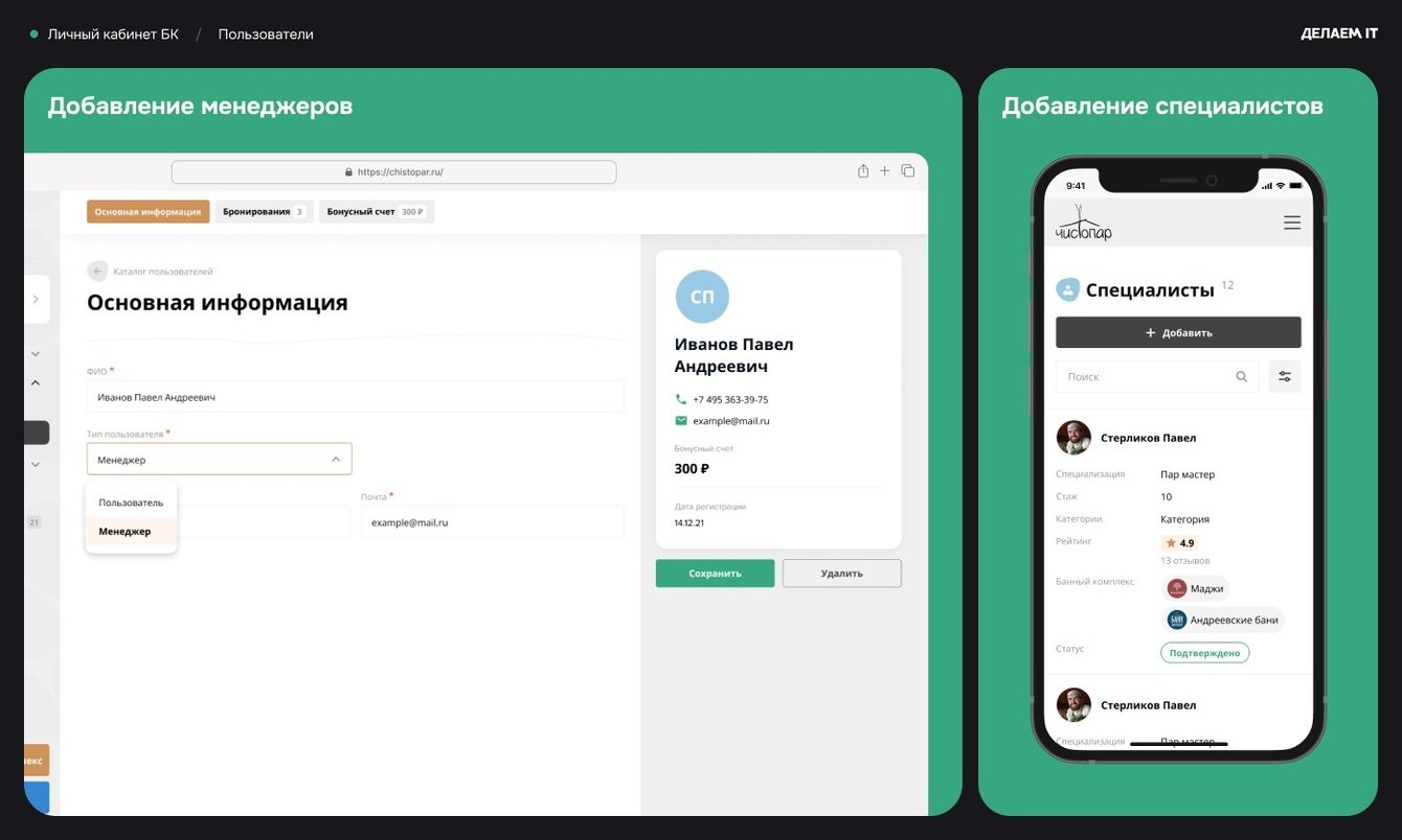 После одобрения заявки владелец банного комплекса получает статус Менеджера. Ему открывается доступ к редактированию всей информации о заведении: описание, атрибуты, услуги, контакты, сотрудники. Менеджер также может менять визуал карточки: добавлять фото и видео.