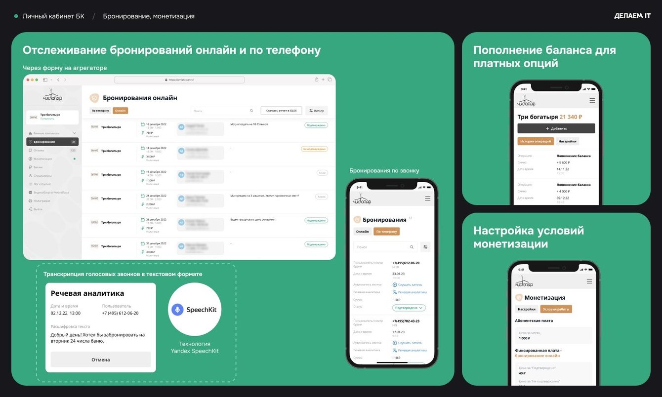 - монетизация за каждое бронирование — онлайн и по телефону;