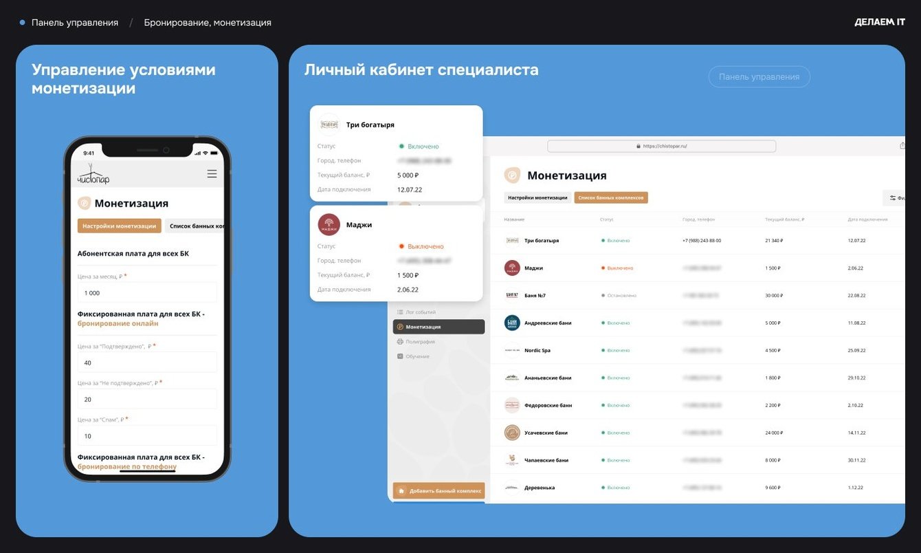 - Владелец бани получает права на управление карточкой: редактирование информации, подключение сотрудников, прием заявок. У бизнеса появляется готовый канал продаж с высокой конверсией.