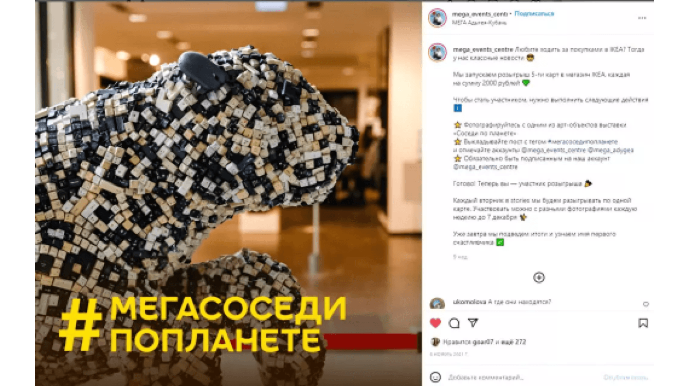 Экоконкурс #мегасоседипопланете. Раз в неделю подводили итоги, главный приз —карта магазина IKEA. В МЕГЕ необходимо сфотографироваться с одним из арт-объектов выставки «Соседи по планете». Далее выложить пост с тегом #мегасоседипопланете и отметить аккаунты @mega_events_centre @mega_adygea. Раз в неделю происходит сбор всех постов за указанный период, каждому присваивается номер. С помощью рандомайзера определяем победителя, который получает приз — карта магазина IKEA номиналом 2000.Общее кол-во участников — более 300 человек.