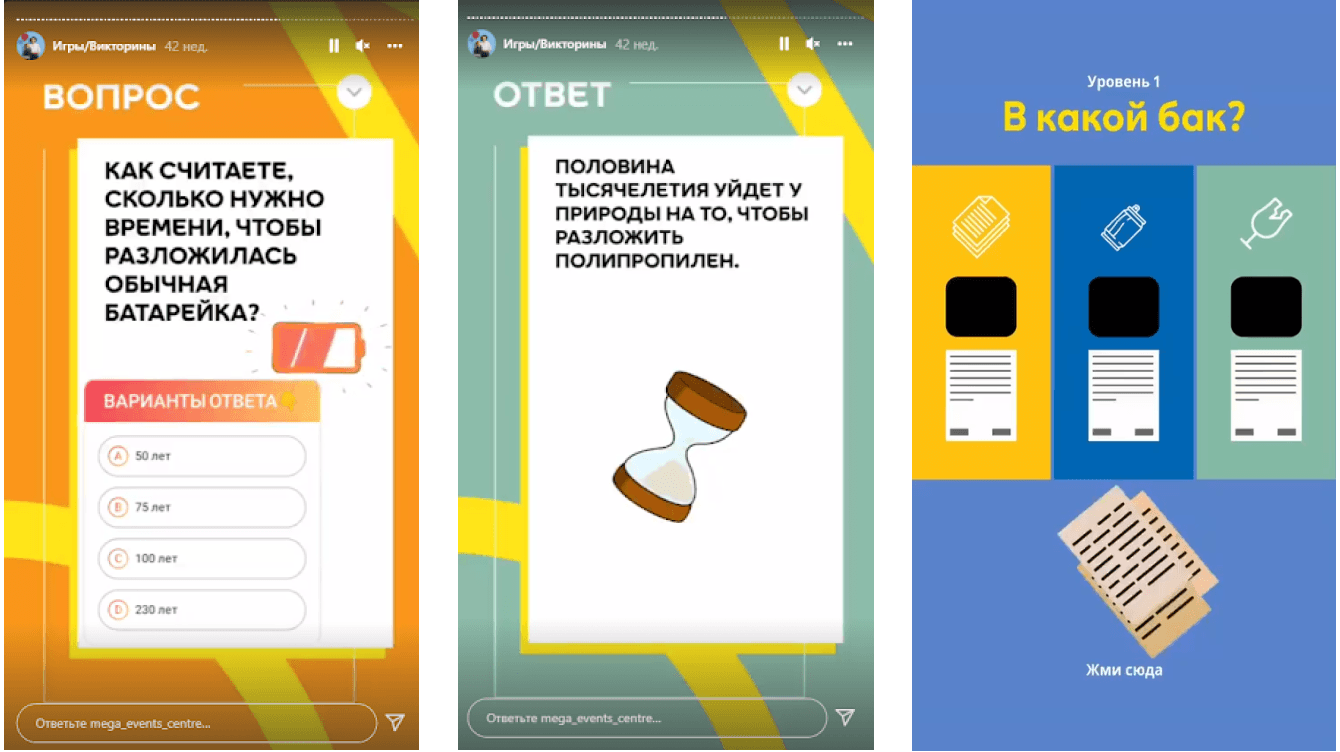 Игра в stories на тему «Сортировки отходов». Мы сделали анимационную серию stories, где можно понять как правильно сортировать отходы. В игре есть три бака. В каждой stories появляется одна из фракций, которую нужно распределить в нужный бак. По окончанию времени stories фракция сама отправлялась в нужный бак, если подписчик не знал.