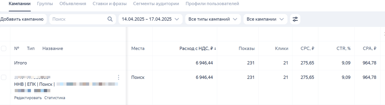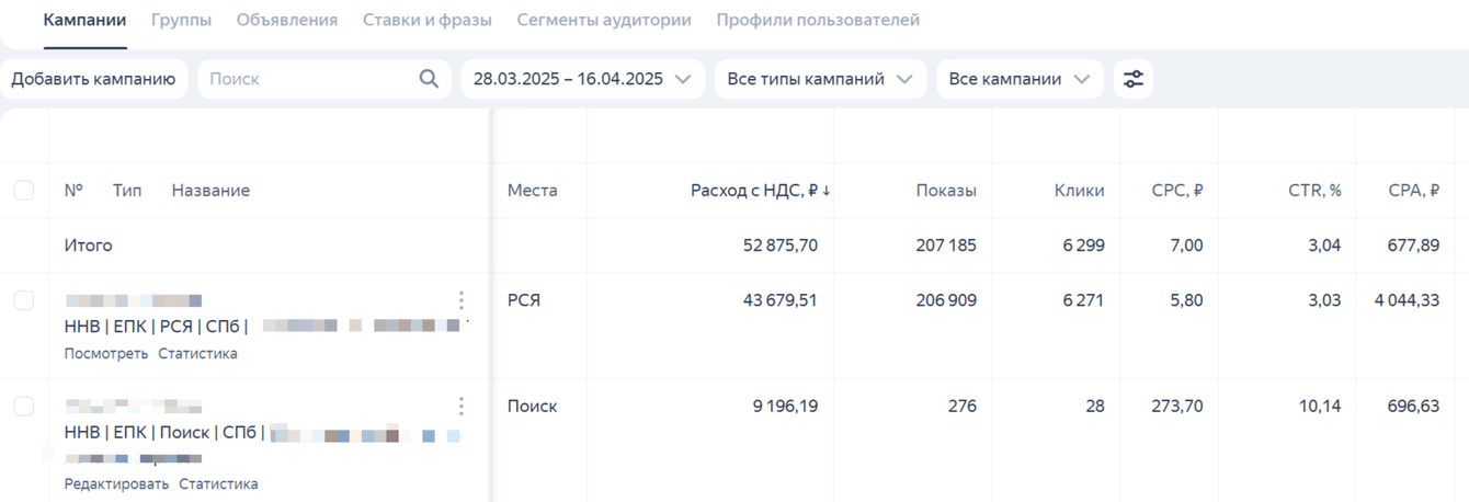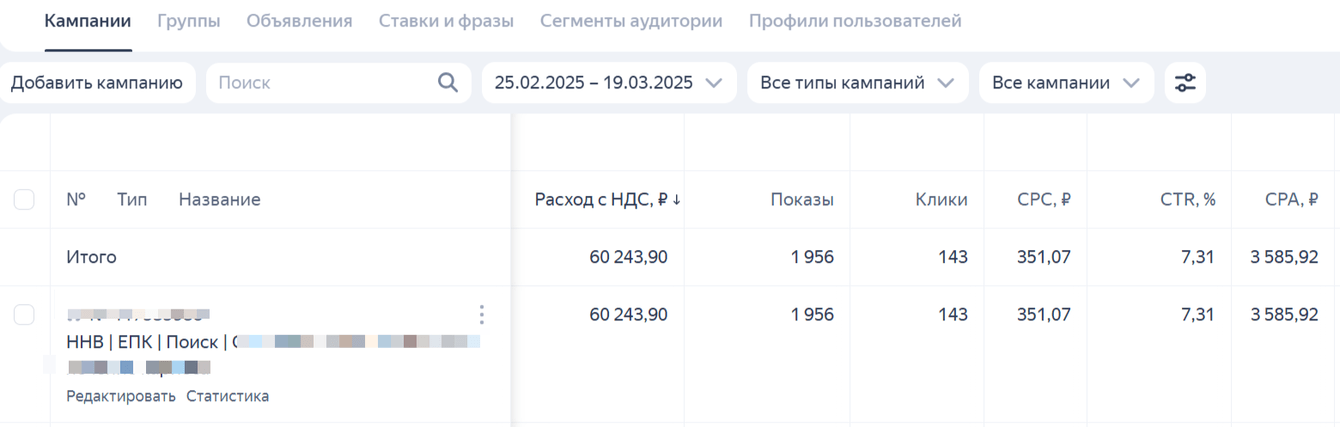 С 25 февраля по 19 марта 2025 года была запущена первая рекламная кампания исключительно в поисковой сети Яндекса.